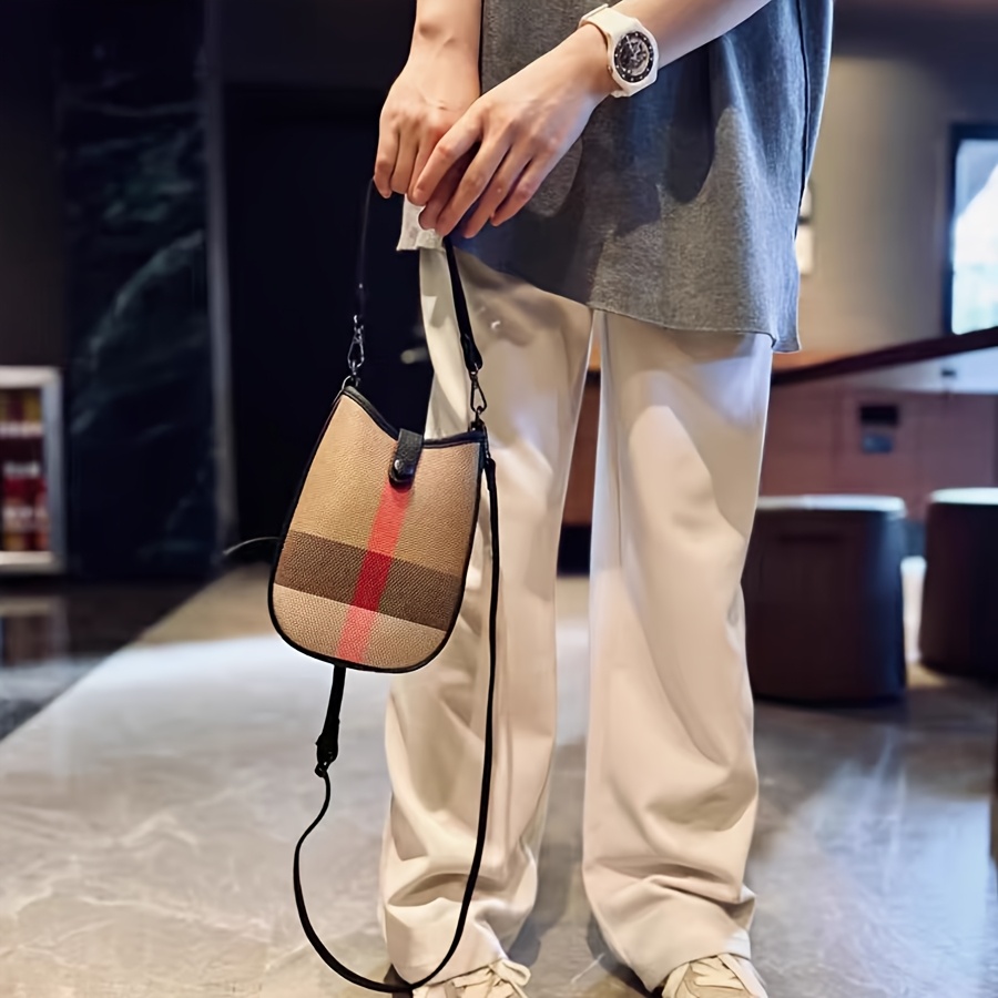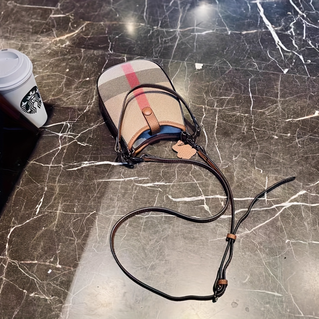 New Genuine Leather Crossbody Bag - Plaid Checkered Design, Detachable Strap & Snap Closure, Large Phone Compartment, Casual Chic Style in Caramel & Black for Everyday Use
